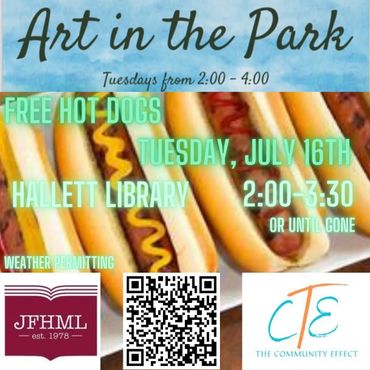 C0-Hosted with the Hallett Library, "Arts in the Park" is a weekly activity that offers a different art project each session, along with a meal provided for participants. This event takes place at the library every Tuesday from 2 to 4 PM.